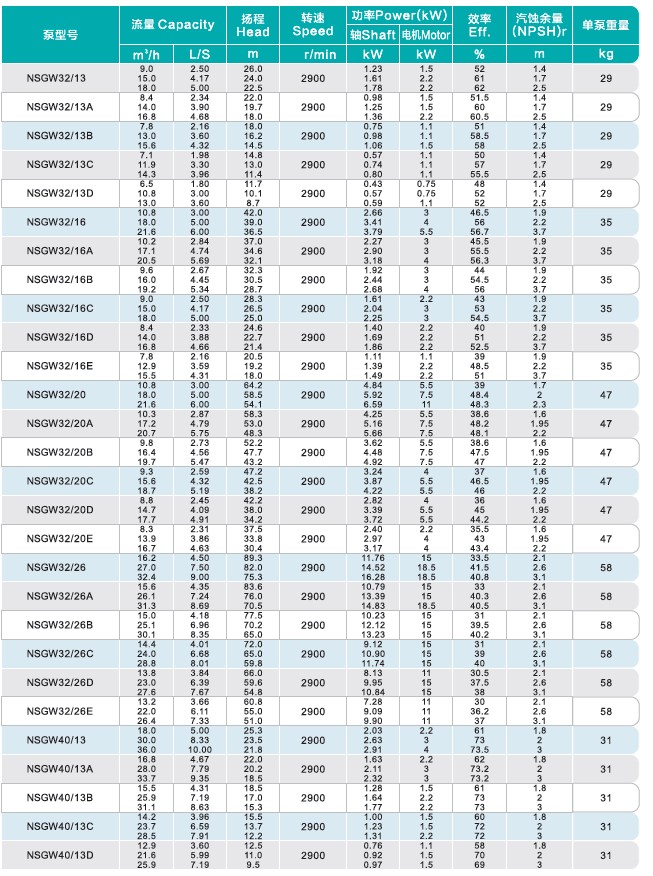 NSGW型泵供吸送清水及物理化學(xué)性質(zhì)類似于水的液體,適用于工廠、礦山、城市給水排水、空調(diào)、消防和農(nóng)囚排灌之用。規(guī)格相同的泵因改變?nèi)~輪外徑而有不同的性能(在泵型號(hào)后而加上A,B,C等字母表示)。本泵結(jié)構(gòu)簡單,性能可靠,體積小,重量輕,抗汽蝕性能好電耗低,使用維修方便。