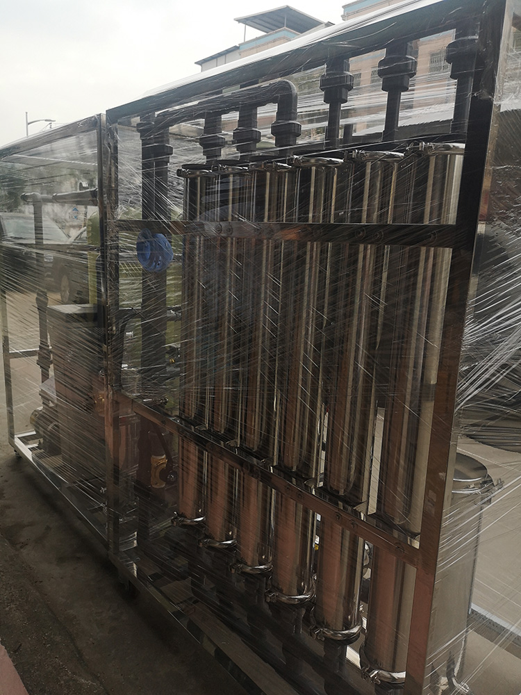 自來水---->原水箱---->供水泵---->多介質過濾器---->活性炭過濾器---->軟化過濾器---->保安過濾器---->高壓泵---->反滲透機組---->純水箱---->恒壓輸送系統---->用水點